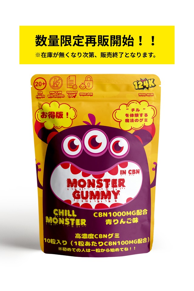 【商品詳細】 ●カンナビノイド含有量:1000mg(1粒当たりCBN100mg) ●賞味期限:商品裏面に記載 ●保存方法:常温保存推奨。直射日光や高温多湿の所での保存は避けて下さい。 ●内容量:10粒 ●味:コーラ味 ●使用方法:就寝前、映画鑑賞、ゲーム等のリラックスタイムの1時間~2時間前くらいを目安にお試しください。効果には個人差がありますが、多くの方が数時間程度感じることがあります。 ●原材料:水飴(国内製造)、砂糖、ゼラチン、麻抽出物、澱粉/ソルビトール、酸味料、香料、ゲル化剤(ペクチン)、光沢剤、甘味料(ステビア)、カラメル色素、乳化剤(一部にゼラチン、りんごを含む) 栄養成分表示 (1粒あたり) エネルギー 13.44kcal たんぱく質 0.28g 脂質 0.12g 炭水化物 3.06g 食塩相当量 0.002g (推定値) モンスターグミは、あなたが今まで経験したことのない新感覚を楽しめるグミです。コーラのフレッシュな味わいで、1粒でもほどよいリラックス感や睡眠の質向上があるというお客様もいらっしゃいます。 ・気分をリフレッシュしたいとき ・楽しい気分になりたいとき ・新しいアイデアを考えるきっかけが欲しいとき 等のシチュエーションをお求めの方は、まずは少量からお試し頂きご自身に合った用量をお探しください。 ※ 体感には個人差があります。ご自身に合った用量でお楽しみください。また、本商品は医薬品ではありませんので、効果や効能を保証するものではありません。 モンスターグミの特徴は、CBN(カンナビノール)成分にあります。CBNは成熟した麻の茎から抽出される成分で、抗不安効果やリラックス効果、睡眠の質向上など様々な効果が期待されています。モンスターグミは、CBNの力を最大限に発揮させるために、CBNを500mg含んでいます。 ストレスや疲労に悩んでいる方にとって、モンスターグミは心身のリラックスへの助けとなるかもしれません。このグミを食べて、日常の中で気分転換を楽しんでみませんか? モンスターグミは、おやつとしてだけでなく、リラックスしたいときにおすすめです。疲れた体や心を癒したいときや、日々の生活をリフレッシュさせたい方におすすめです。 ※ご使用の際は注意点を守ってください。本商品はCBNを含んでいますが、THC(テトラヒドロカンナビノール)は含まれておりませんので、違法な物質ではありません。また、本商品は医薬品ではありませんので、効果や効能を保証するものではありません。